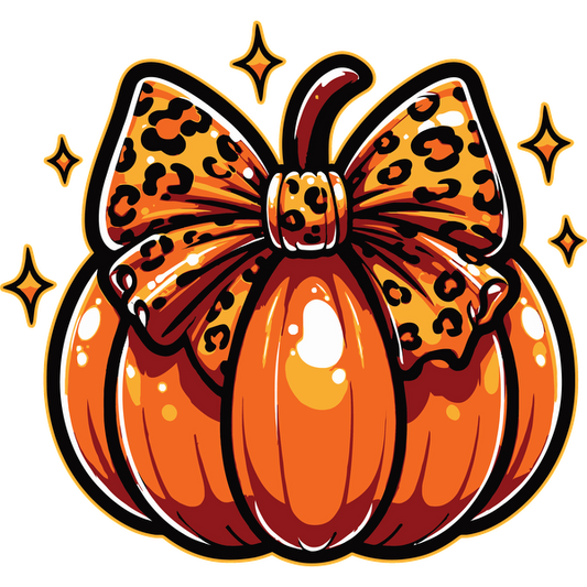 A vibrant orange pumpkin adorned with a stylish leopard print bow, radiating charm and seasonal flair. dtf transfers