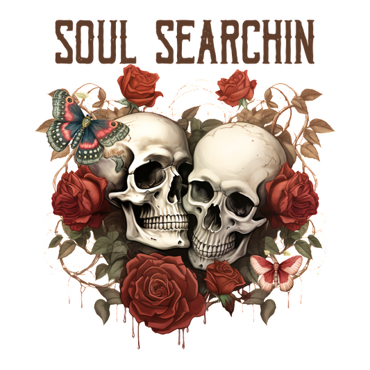 A striking graphic featuring two skulls surrounded by roses and butterflies, with the words "Soul Searchin" prominently displayed. heat press transfers