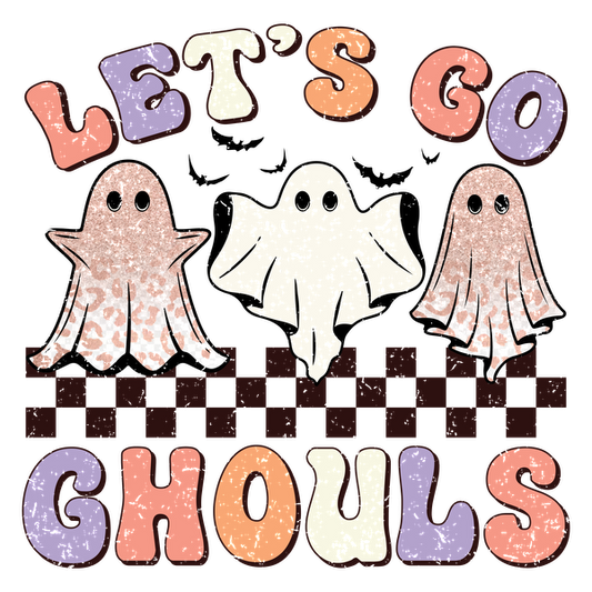 A playful Halloween-themed design featuring three cute ghosts and the cheerful phrase "Let's Go Ghouls!"dtf regular iron