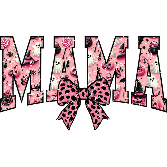 A fun and playful "MAMA" design featuring bright colors, candy motifs, and a stylish black and pink bow. dtf prints