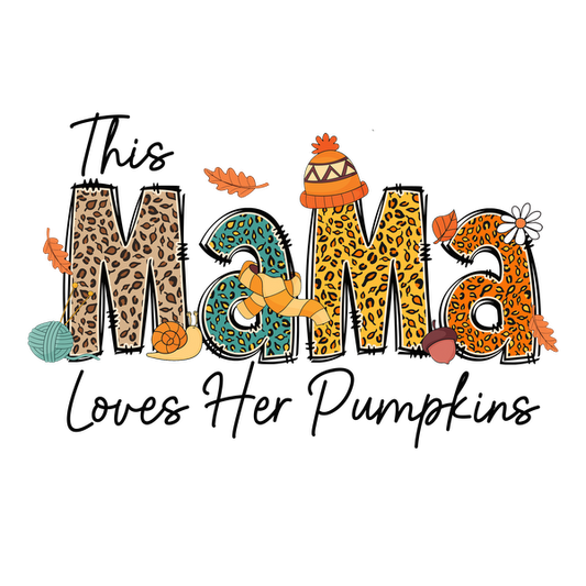 A festive and playful design featuring the phrase "This Mama Loves Her Pumpkins" in colorful, patterned letters with autumn accents.dtf regular iron