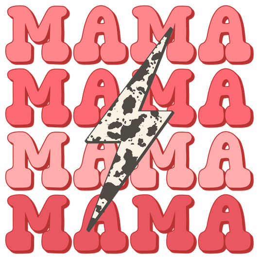 A playful design featuring the word "MAMA" in varying shades of pink, accented by a striking lightning bolt. heat press transfers