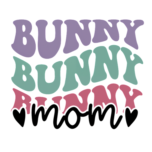 A playful design featuring the word "Bunny" in colorful, stylized letters, topped with "Mom" in a whimsical font.DTF Transfersdtf regular iron