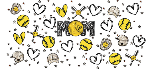 A playful and colorful design featuring softball motifs, including balls, bats, and caps, with hearts accentuating a love for the sport.UV Transfers heat press transfers