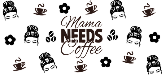 A playful design featuring the phrase "Mama Needs Coffee" surrounded by cute coffee cup illustrations, perfect for coffee lovers.UV Transfersdtf regular iron