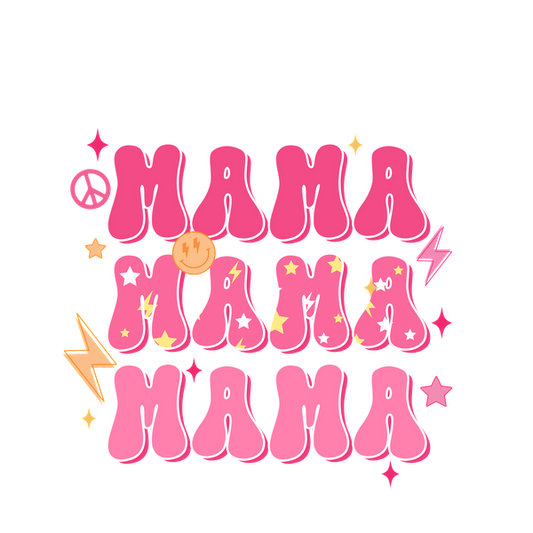A playful and vibrant design featuring the word "MAMA" in bold pink letters, adorned with stars and playful symbols. dtf transfers