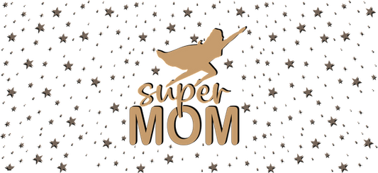 A playful "Super Mom" graphic featuring a superhero mom silhouette, surrounded by a starry background in warm tones.UV Transfersdtf regular iron