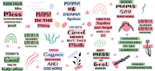 A fun and colorful collection of humorous quotes and phrases celebrating the joys and challenges of motherhood.UV Transfersdtf regular iron