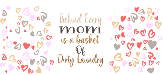 A playful and colorful design highlighting the phrase, "Behind Every Mom is a Basket of Dirty Laundry," surrounded by heart motifs.UV Transfers dtf transfers