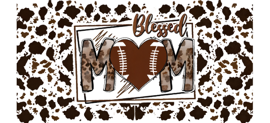 A stylish graphic design featuring "Blessed MOM" with a heart and football elements, set against a trendy leopard print background.UV Transfers dtf transfers