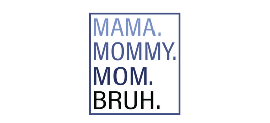 A playful graphic featuring the words "MAMA. MOMMY. MOM. BRUH." in bold typography, highlighting the various ways to address mothers.UV Transfers heat press transfers
