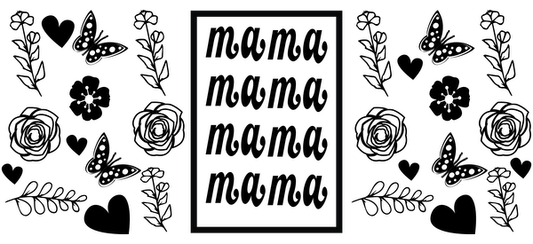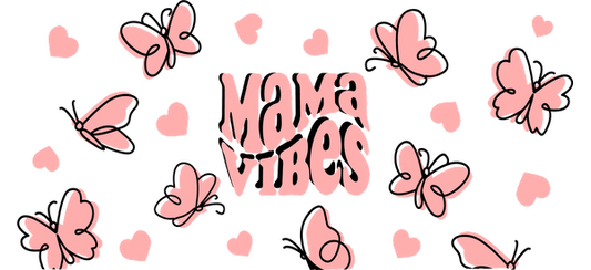 A playful design featuring the words "Mama Vibes" surrounded by pastel pink butterflies and hearts, radiating warmth and love.UV Transfersdtf regular iron