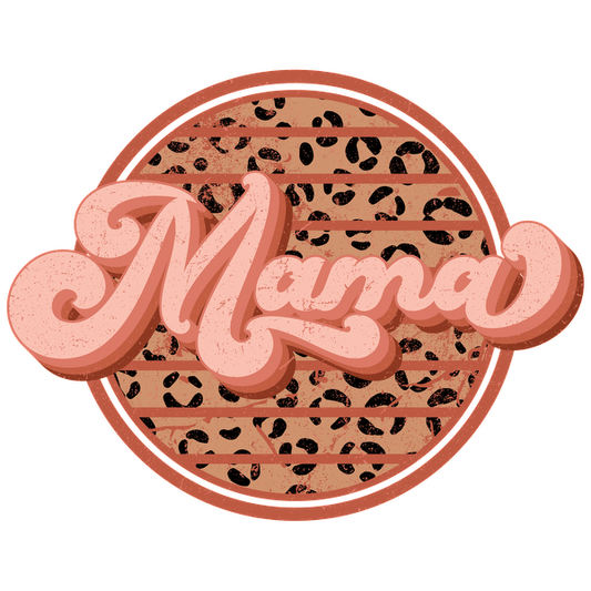 A stylish circular graphic featuring the word "Mama" in bold, pink script on a textured background with leopard print accents. dtf transfers