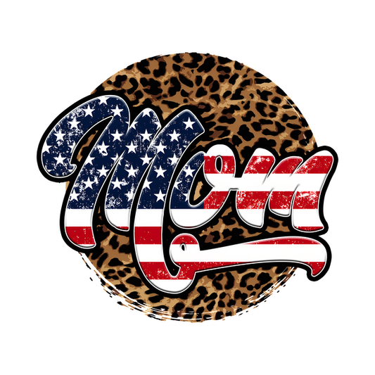 Stylish "Mom" graphic featuring a patriotic American flag design, set against a bold leopard print background.
