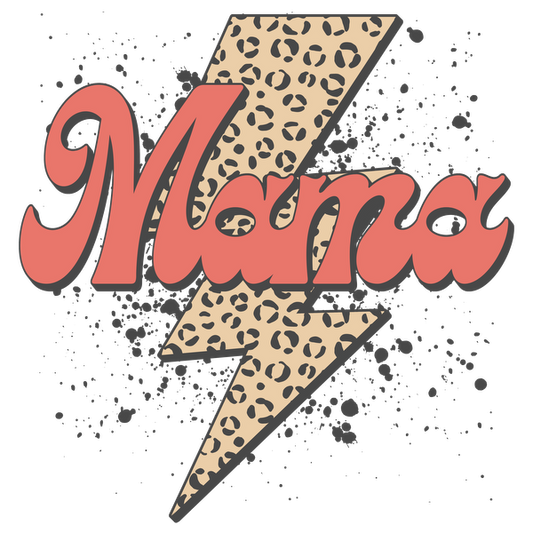 This vibrant graphic features the word "Mama" in playful pink letters, accented with a leopard print lightning bolt.