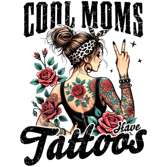 Stylish tattooed woman with roses, showing peace sign in vibrant colors.DTF Transfers