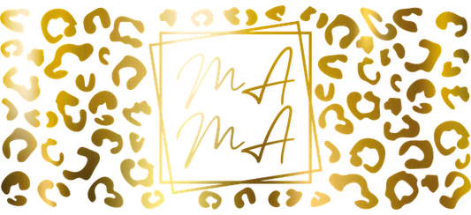 Stylish logo featuring a gold leopard print background with elegant cursive lettering in a decorative square frame.UV Transfers