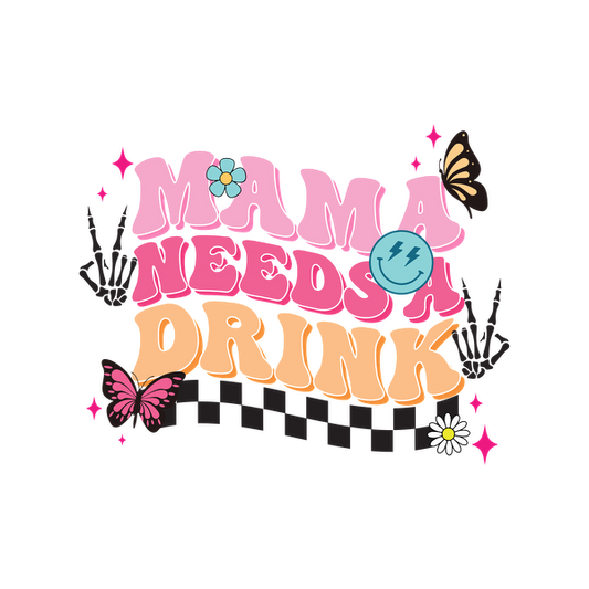 Whimsical graphic featuring colorful text that reads "Mama Needs a Drink," adorned with butterflies and flowers for a fun touch.