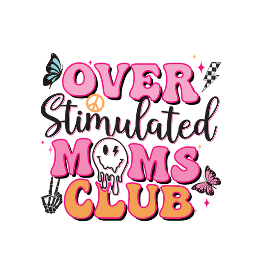 Playfully designed "Over Stimulated Moms Club" graphic featuring vibrant colors, butterflies, and fun motifs, perfect for quirky mom apparel. dtf transfers
