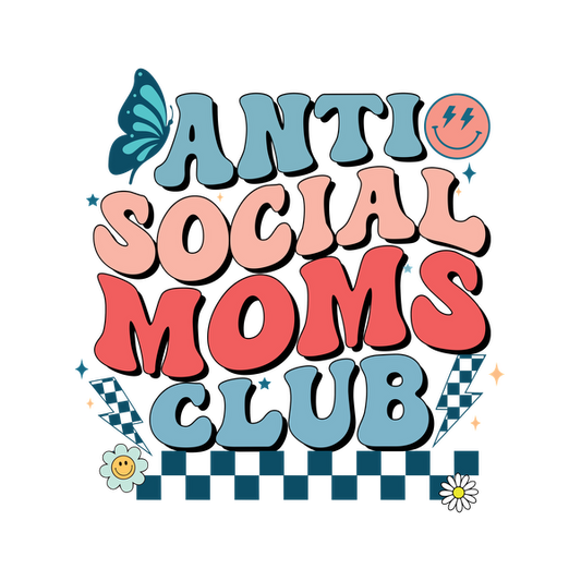 Playful and vibrant graphic reading "Anti Social Moms Club," adorned with fun motifs like butterflies, flowers, and smiley faces. heat press transfers
