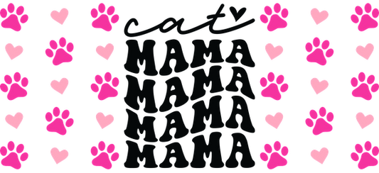 This is a "Cat Mama" sticker in neon pink paw prints on a black background.UV Transfers