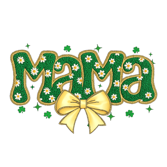 《3D chenille-like》A green and yellow "Mama" word with daisies and a yellow bow.DTF Transfers