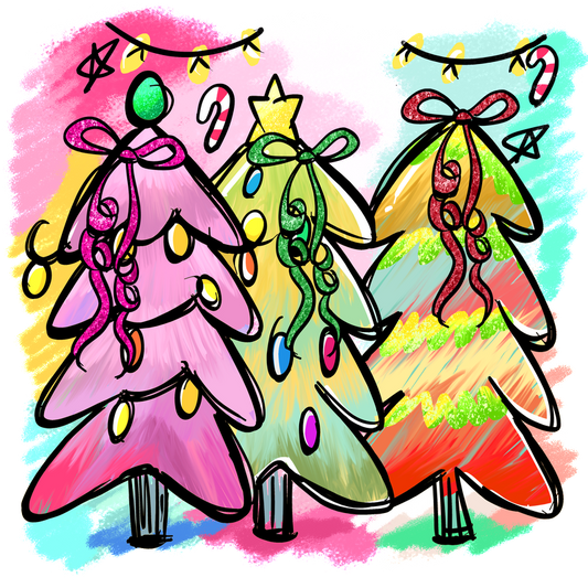 Colorful, whimsical Christmas trees with decorations and ribbons, perfect for festive vibes!DTF Transfers