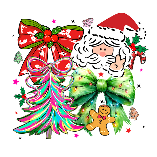 A cheerful Christmas collage featuring Santa, colorful bows, a decorated tree, and gingerbread.DTF Transfers