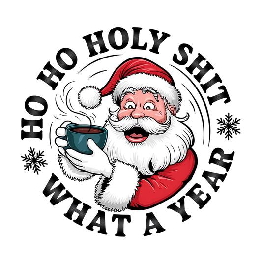 Cheerful Santa holding a coffee cup with humorous holiday phrase design.DTF Transfers