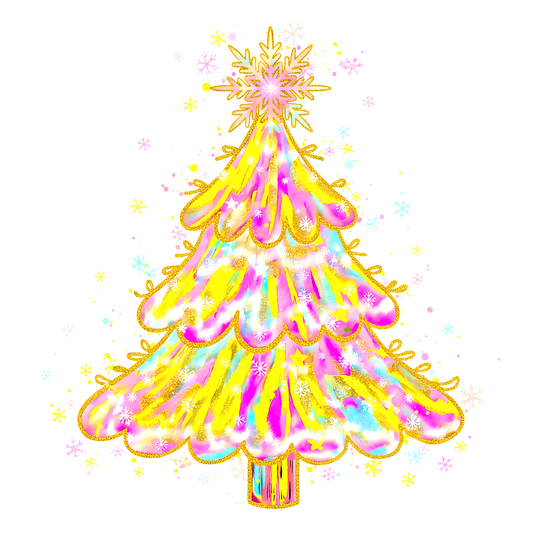 A vibrant, colorful illustration of a whimsical Christmas tree with sparkles.DTF Transfers