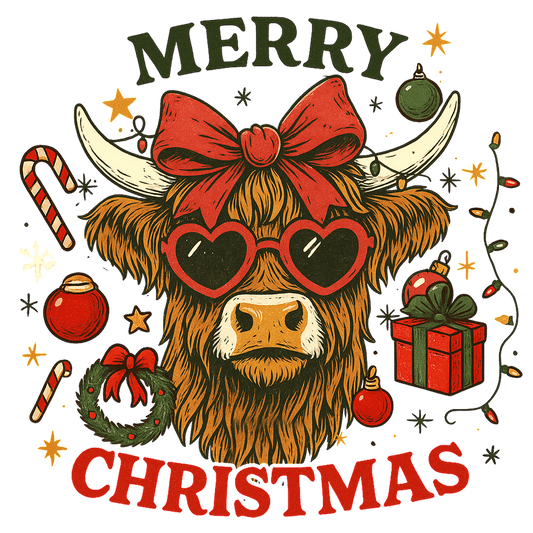 A whimsical illustration featuring a stylish cow in glasses, celebrating Christmas!DTF Transfers