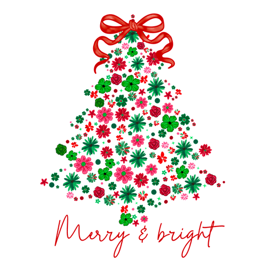 Festive floral Christmas tree adorned with a cheerful red bow and "Merry & bright".DTF Transfers