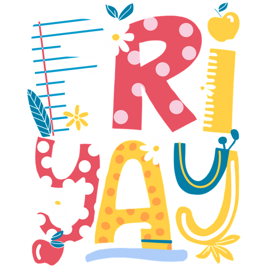 Colorful "FRI-YAY" graphic with playful stars, daisies, and a pencil design!DTF Transfers