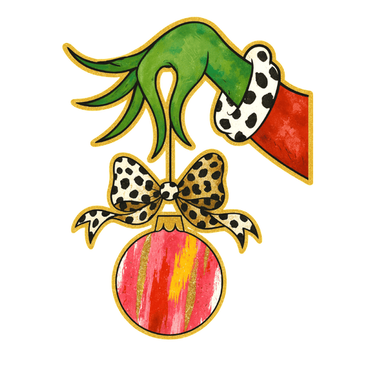 A whimsical green hand is hanging a colorful Christmas ornament with a bow.DTF Transfers