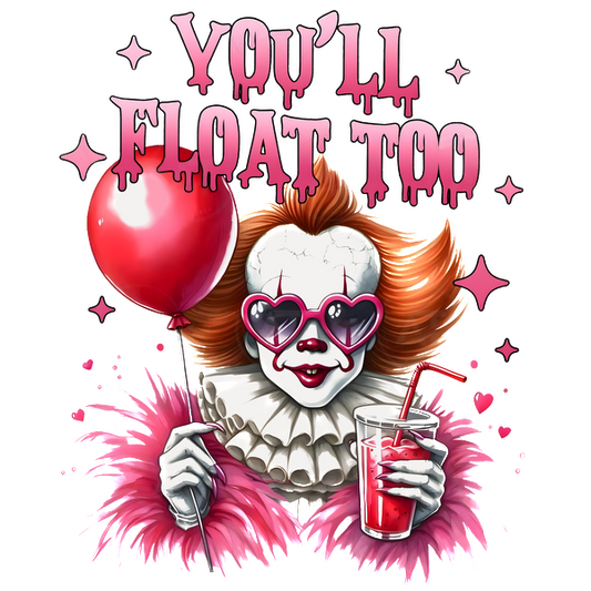 A vibrant and quirky clown illustration holding a red balloon and a drink, featuring the phrase "YOU'LL FLOAT TOO."dtf regular iron