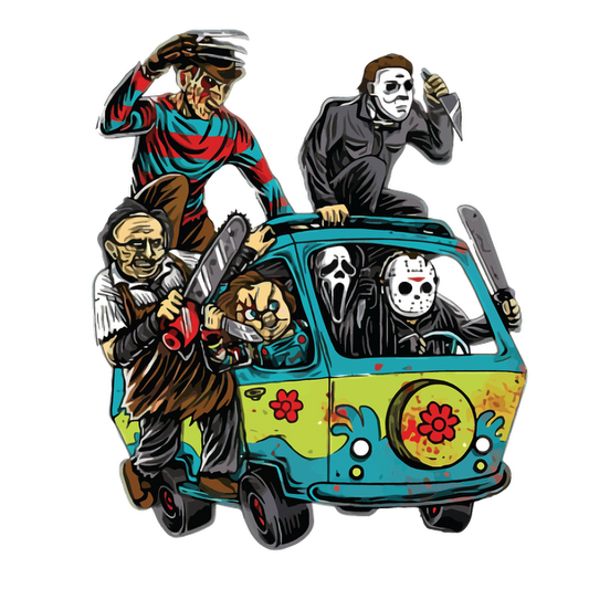 Prix habituel À partir de £0.75 GBPPrix habituelPrix unitaire / par£2.40 GBPPrix promotionnel À partir de £0.75 GBPA colorful van filled with iconic horror movie characters, each brandishing weapons and showcasing a playful yet spooky vibe. dtf transfers