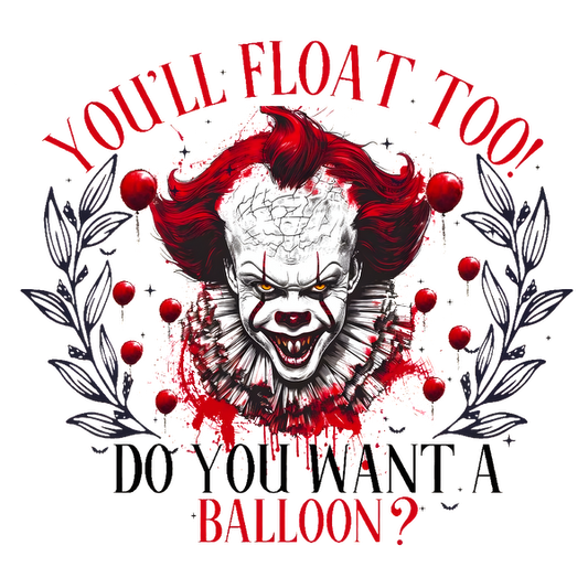 A spooky design featuring a menacing clown with vibrant hair, surrounded by balloon motifs and the phrase "You'll float too!"dtf regular iron