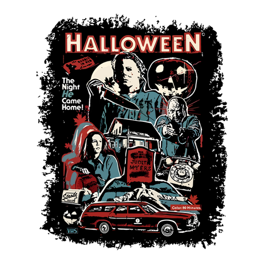 This vibrant Halloween-themed artwork features iconic characters and imagery from the classic horror film, evoking a nostalgic VHS style.