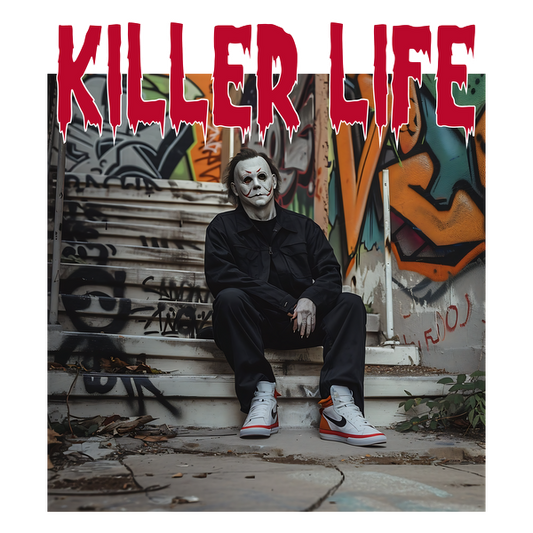 A striking illustration features a character in a "THUG LIFE" shirt, holding a knife, seated on graffiti-covered stairs. heat press transfers
