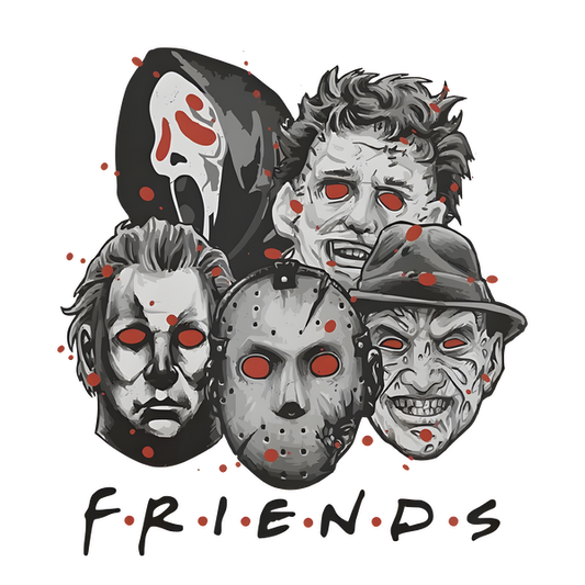 A spooky graphic featuring iconic horror movie characters' masks, showcasing a playful take on "Friends" with a colorful twist. heat press transfers