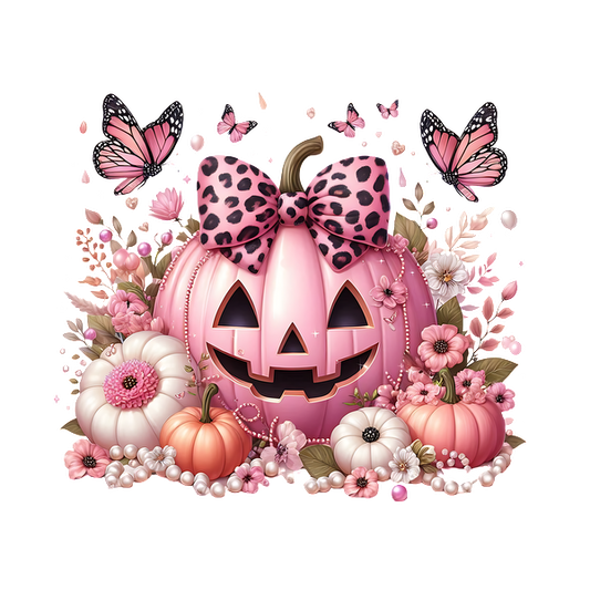 A whimsical pink pumpkin with a leopard print bow, surrounded by pastel flowers and butterflies, perfect for festive charm. dtf prints