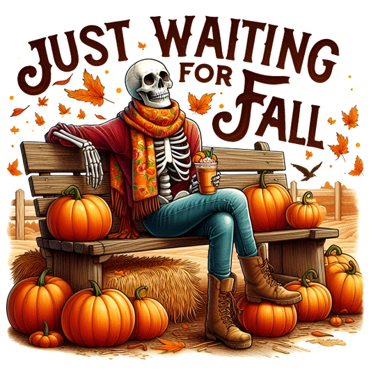A cheerful skeleton in a cozy scarf enjoys a drink on a bench surrounded by pumpkins, celebrating the fall season.dtf regular iron