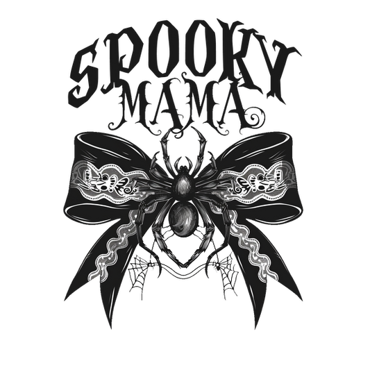 This spooky design features a decorative bow with a detailed spider and the words "Spooky Mama" in bold lettering.