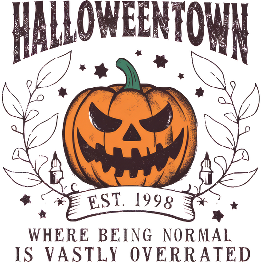 A playful Halloween-themed graphic featuring a smiling pumpkin, surrounded by stars and foliage, celebrating the spirit of Halloweentown since 1998. dtf prints dtf transfers