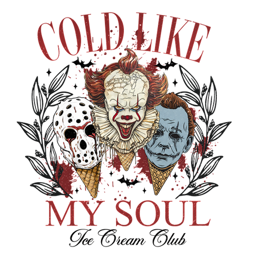 This graphic features a chilling design with iconic horror characters, including a clown and masked figures, highlighted by the phrase "Cold Like My Soul."