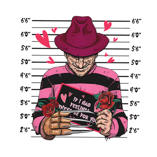 A playful illustration of a horror character with a striped shirt and a pink hat, holding a love-themed card surrounded by roses. heat press transfers