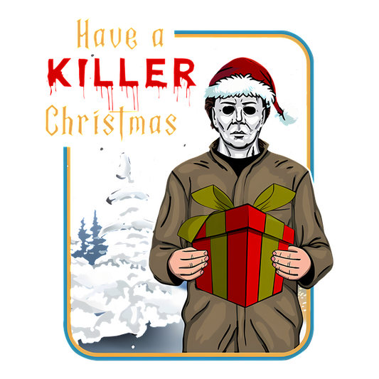 This festive illustration features a character in a Santa hat holding a gift, promoting a playful yet spooky "Have a KILLER Christmas."