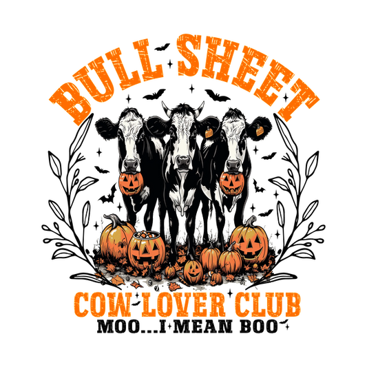 A playful graphic featuring three cows with pumpkin heads, surrounded by autumn pumpkins, celebrating the "Bull Sheet Cow Lover Club." dtf prints