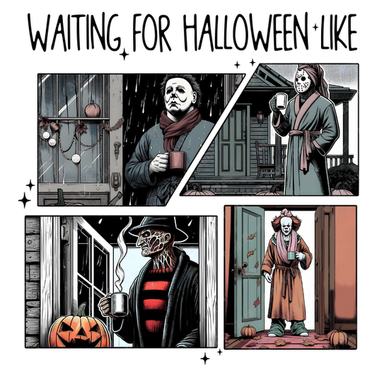 A humorous comic strip featuring iconic horror characters cozily waiting for Halloween, each holding a coffee mug in different spooky settings.dtf regular iron