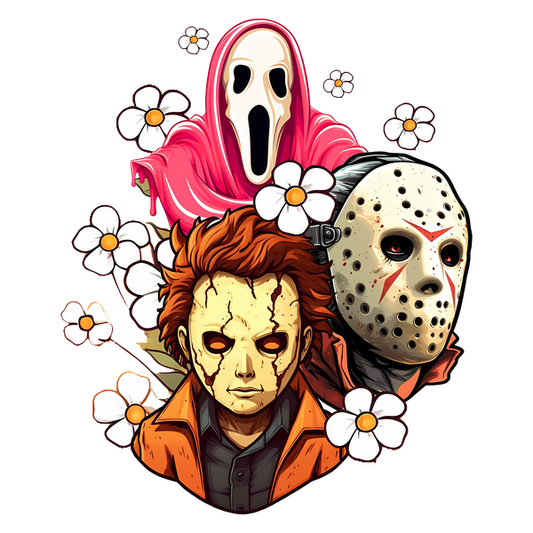 A vibrant, artistic illustration featuring iconic horror characters surrounded by delicate flowers, blending terror with playful charm. dtf transfers